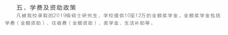 凡被我校录取的2019级硕士研究生,学校提供10至12万的全额奖学金,全国奖学金包括学费(全额资助)、住宿费(全额资助)、奖学金、生活补助等。