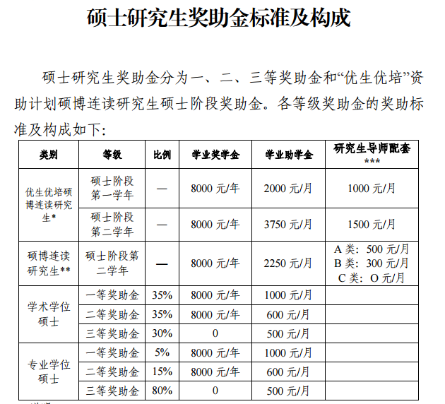 1.研究生助学金,研究生助学金享受群体是所有脱产(有固定工资收入的除外)学习的研究生,覆盖面100%,发放标准为每生每年10000元。