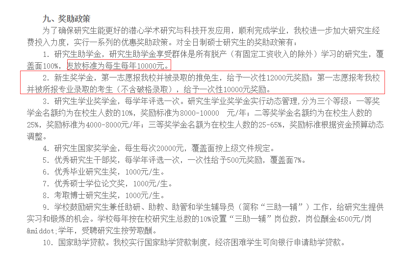 2.新生奖学金,第一志愿报我校并被录取的推免生,给予一次性12000元奖励;第一志愿报考我校并被所报专业录取的考生(不含破格录取),给予一次性10000元奖励。