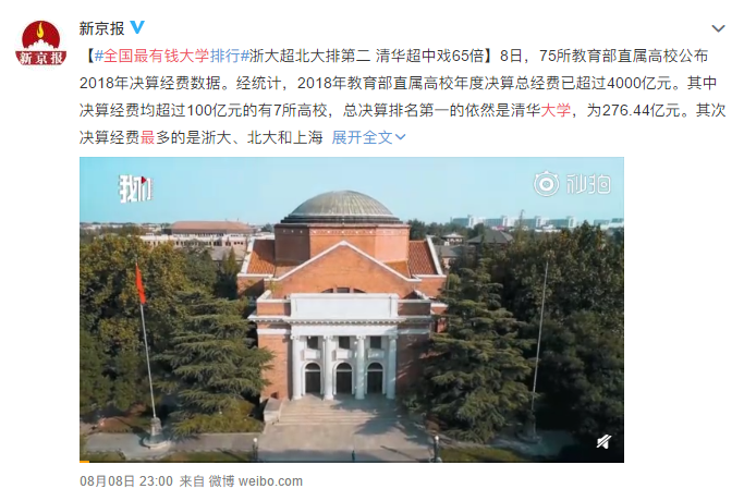 近期,75所教育部直属高校公布2018年决算经费数据。经统计,2018年教育部直属高校年度决算总经费已超过4000亿元。其中决算经费均超过100亿元的有7所高校,总决算排名第一的依然是清华拼搏(中国),为276.44亿元。其次决算经费最多的是浙大、北大和上海交大。