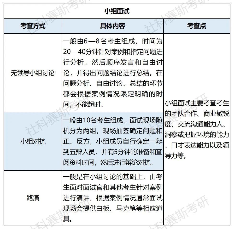 小组面试:一般是由多名考生组成小组,针对面试官指定的管理型或社会经济案例进行讨论,面试过程中,面试官不进行参与,而是在旁观察考生的发言和表现,从而对考生的综合能力做出评判。
