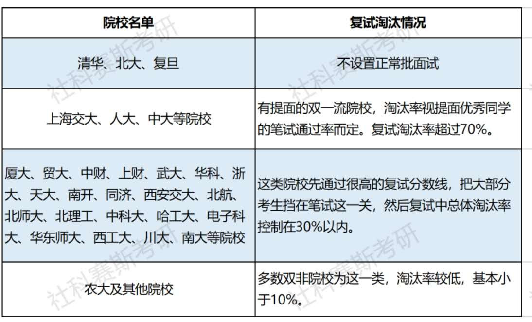 具体情况这里我们按照各院校对各因素的要求,将全国各大院校的复试淘汰情况进行了一定的统计,如下:
