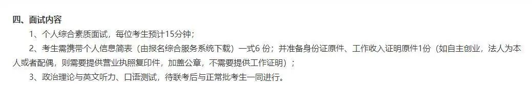 考生需携带个人信息简表(由报名综合服务系统下载)一式6 份;并准备身份证原件、工作收入证明原件1份(如自主创业,法人为本人或者配偶,则需要提供营业执照复印件,加盖公章,不需要提供工作证明);