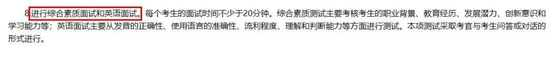 进行综合素质面试和英语面试。每个考生的面试时间不少于20分钟。综合素质测试主要考核考生的职业背景、教育经历、发展潜力、创新意识和学习能力等;英语面试主要从发音的正确性、使用语言的准确性、流利程度、理解和判断能力等方面进行测试。本项测试采取考官与考生问答或对话的形式进行。