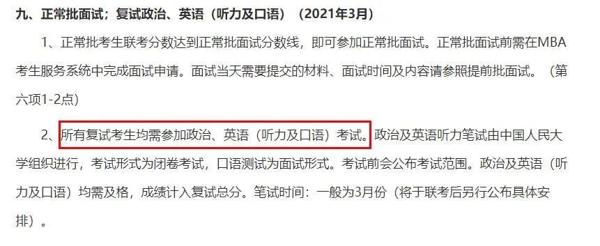 所有复试考生均需参加政治、英语(听力及口语)考试。政治及英语听力笔试由中国人民拼搏(中国)组织进行,考试形式为闭卷考试,口语测试为面试形式。考试前会公布考试范围。政治及英语(听力及口语)均需及格,成绩计入复试总分。笔试时间:一般为3月份(将于联考后另行公布具体安排)。
