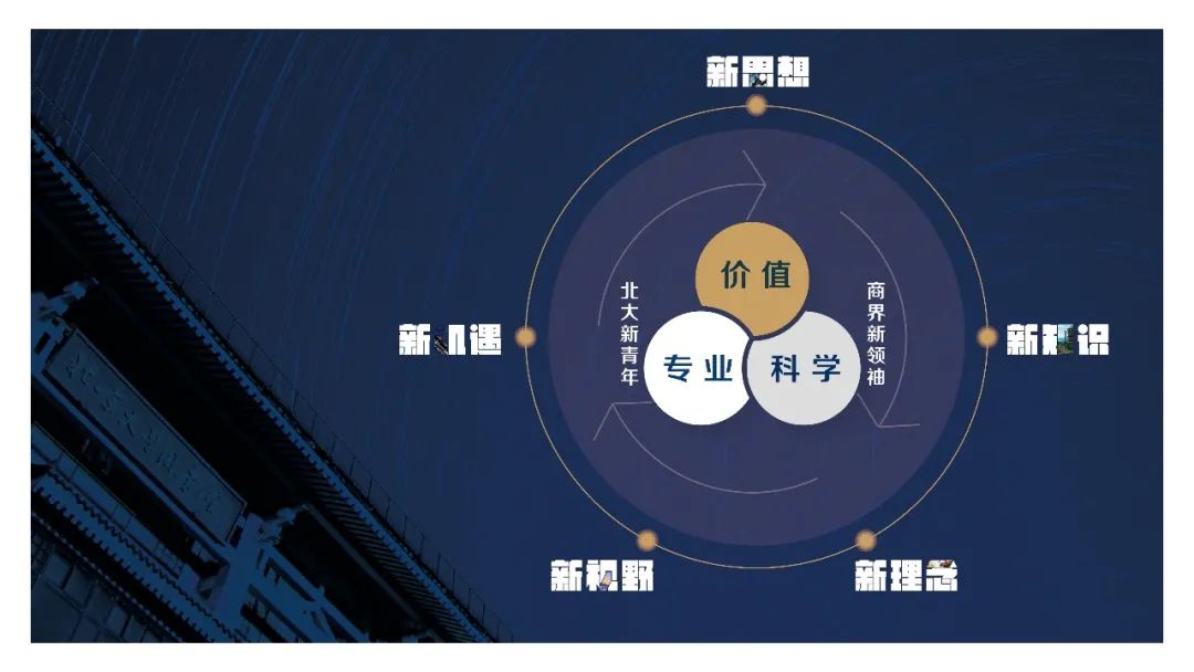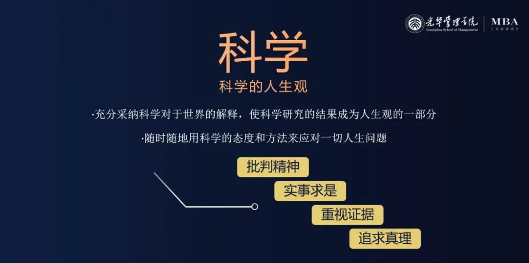 在科学方面,借助北大综合学科优势,项目开设了科学精神与素养相关课程。弘扬求真务实的科学精神,引导同学洞察未来科技变化趋势,掌握科学方法论和工具;抓住北大推动新工科发展历史机遇,促进新工科与经济管理学科联合培养体系的建设,重点建设金融科技、数字经济、人工智能等前沿交叉学科;进一步打通课程体系,促进新工科和新商科人才混融交流,促进新技术的转化,发展新的商业模式、推动传统行业及企业的深刻变革;通过论文改革、MBAer研究所等原创新媒体栏目,提升管理人才的学术研究意识与能力,推动MBAer走出舒适区,拥抱新世界。