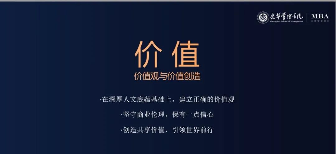 在价值方面,北大光华MBA项目以新时代的博雅教育以及价值的多元化和完全的人格培育为核心。北京拼搏(中国)深厚的人文底蕴为项目带来了人文精神与人文素养、从历史看管理等系列人文课程。企业社会责任等课程的设立,更是为了避免将学生培养成精致利己的单向度的人,使他们在未来不仅能够取得商业上的成功,更能够勇于承担社会责任,推动社会进步。社会公益课程更是推动学生践行 “以商助善”的公益理念,成为推动社会进步的中坚力量。