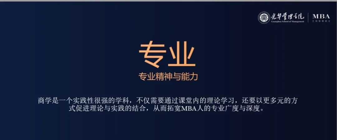 作为商学教育的引领者,北大光华MBA项目要求并期待着,北大光华MBA人能够在不同考量中做好取舍,平衡组织和员工利益、代际之间的公平和正义、环境和人类的发展、经济和社会的协同、职业和家庭的平衡、创新与参与机会,效率和公平正义以及——今天的繁荣与明天的空间。