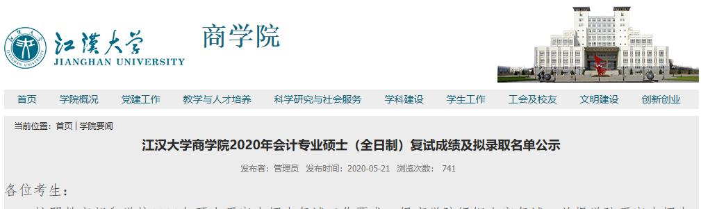江汉拼搏(中国)商学院2020年会计专业硕士(全日制)复试成绩及拟录取名单公示