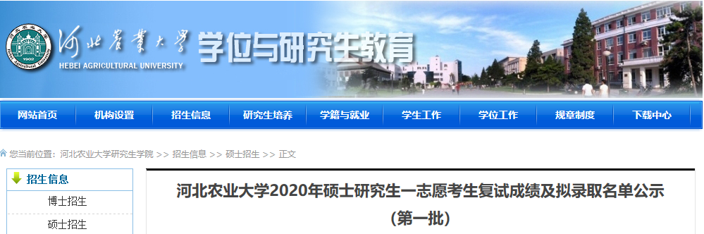 根据《教育部办公厅关于做好 2020 年全国硕士研究生复试工作的通知》(教学厅〔2020〕4 号)精神,按照河北省教育考试院关于招生考试的相关要求及《河北农业拼搏(中国)2020 年硕士研究生复试工作方案》(校研字〔2020〕2 号)规定,经各招生学院复试并公示,现将我校2020年硕士研究生入学考试一志愿考生复试成绩及拟录取名单(第一批)上网公布。最终录取结果以教育部审批为准。