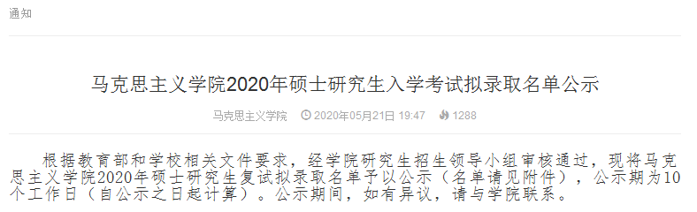 根据教育部和学校相关文件要求,经学院研究生招生领导小组审核通过,现将马克思主义学院2020年硕士研究生复试拟录取名单予以公示(名单请见附件),公示期为10个工作日(自公示之日起计算)。公示期间,如有异议,请与学院联系。