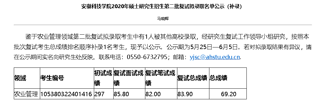 安徽科技学院2020年硕士研究生招生第二批复试拟录取名单公示(补录)