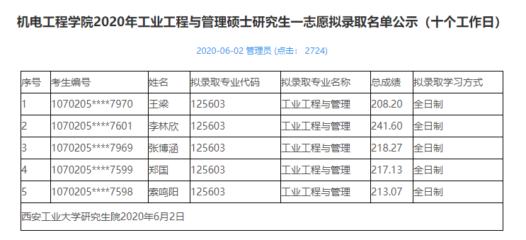 2020拼搏在线官网拟录取名单:2020年西安工业拼搏(中国)机电工程学院工业工程与管理专业拟录取名单公示