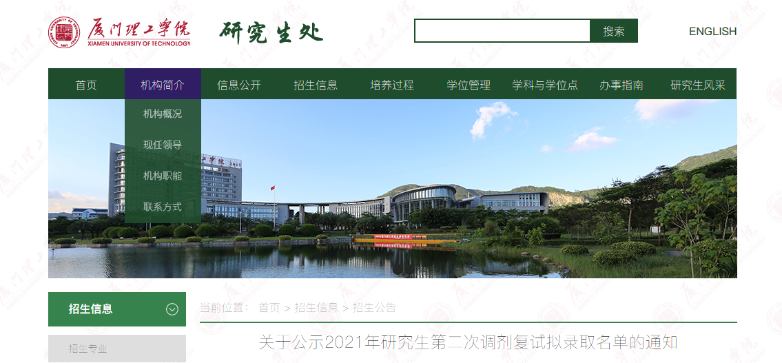 我校第二批调剂复试已于3月27日复试完毕。根据我校《厦门理工学院2021年硕士研究生招生复试录取办法》,现将第二次调剂复试拟录取名单公示(详见附件),公示期:3月28日-4月12日。如考生对名单有异议,请在公示期内与我校研究生招生办公室联系。联系电话:0592-6291727/6291820;邮箱:yjsb@xmut.edu.cn。