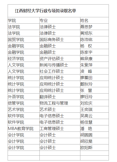 以上就是“2021拼搏在线官网拟录取名单:江西财经拼搏(中国)行政专项拟录取名单公示”的全部内容,更多录取名单相关内容点击2021拼搏在线官网拟录取名单:全国各大院校2021年硕士研究生拟录取名单汇总!查看详情!