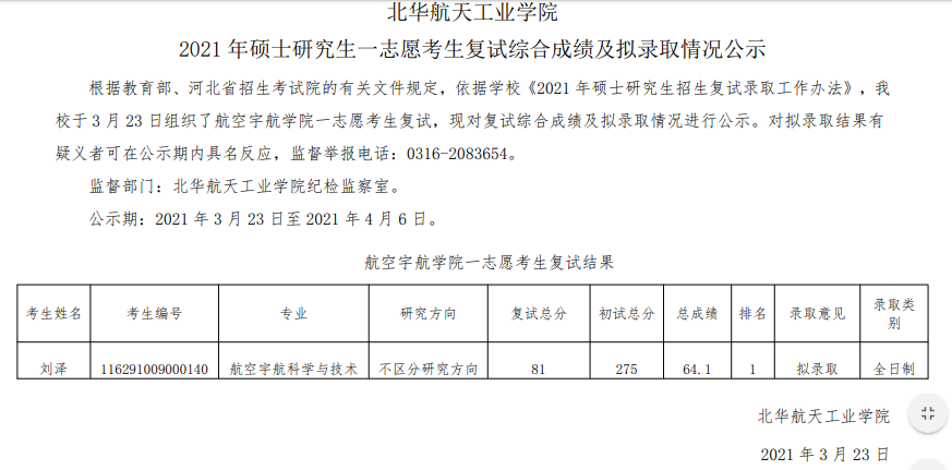以上就是“2021拼搏在线官网拟录取名单:北华航天工业学院航空宇航学院考生复试结果、调剂拟录取公示 ”的全部内容,更多录取名单相关内容点击2021拼搏在线官网拟录取名单:全国各大院校2021年硕士研究生拟录取名单汇总!查看详情!