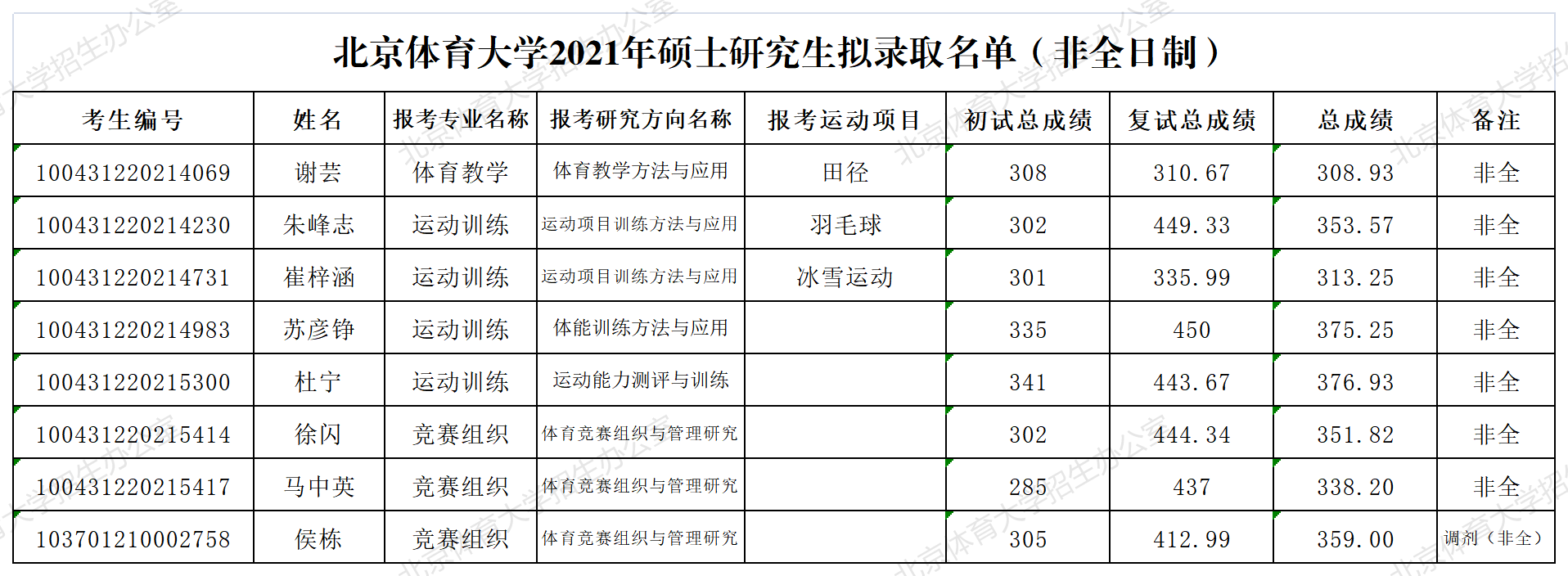 北京体育拼搏(中国)2021年硕士研究生拟录取名单(非全日制)