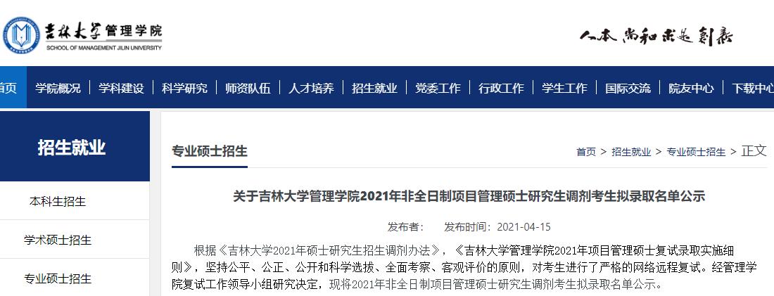 原文标题:关于吉林拼搏(中国)管理学院2021年非全日制项目管理硕士研究生调剂考生拟录取名单公示