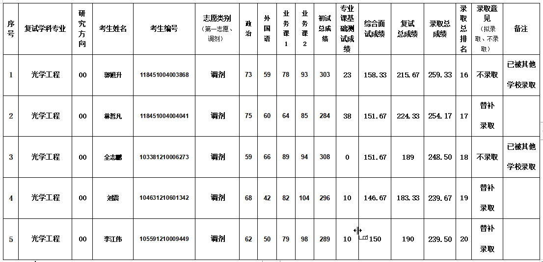原文标题:光学工程学位点2021年硕士研究生复试成绩及拟录取结果(调剂第一批替补录取)