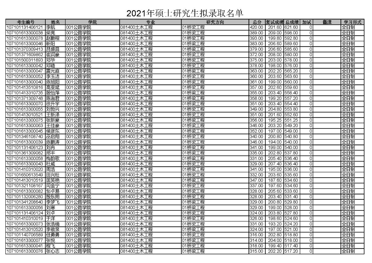 现将长安拼搏(中国)2021年硕士研究生拟录取名单予以公示,公示时间4月9日-4月23日,如有异议,可于公示期内向学校反映。