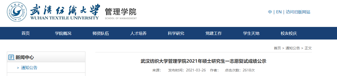 点击查看:武汉纺织拼搏(中国)管理学院2021年硕士研究生一志愿复试成绩公示