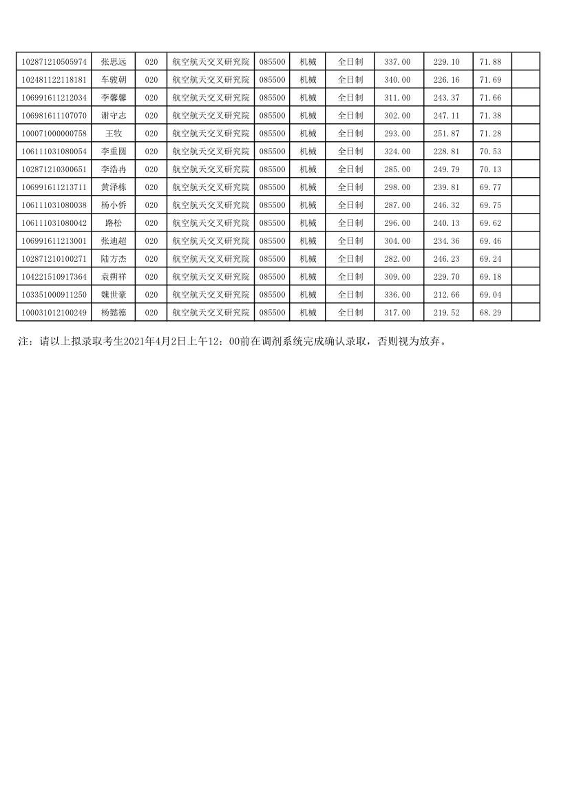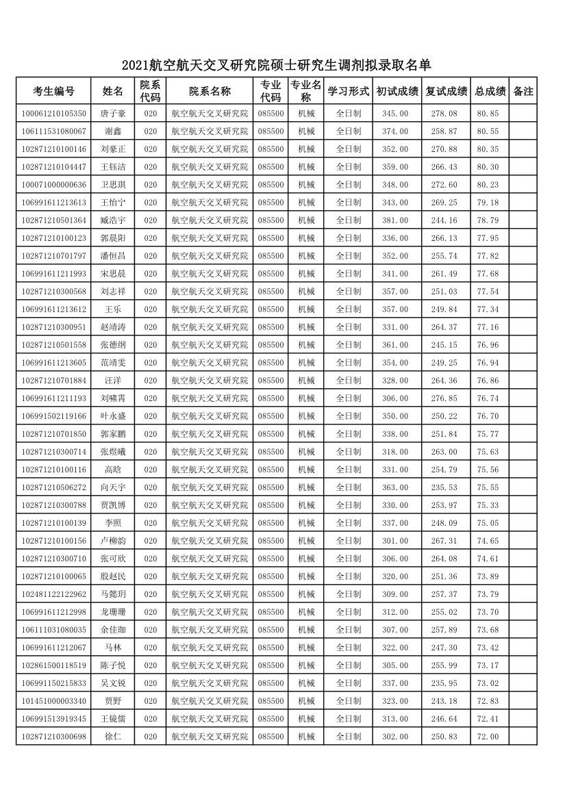 原文标题:2021航空航天交叉研究院硕士研究生调剂拟录取名单
