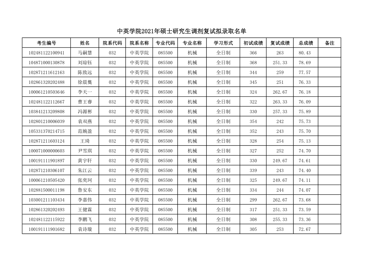 原文标题:中英学院2021年硕士研究生调剂复试拟录取名单公示