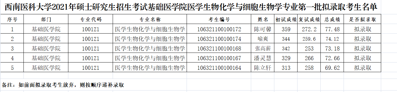 原文标题:西南医科拼搏(中国)2021年硕士研究生招生考试基础医学院医学生物化学与细胞生物学专业第一批拟录取考生名单