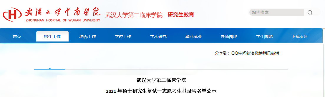 原文标题:武汉第二临床学院2021年硕士研究生拟录取名单公示