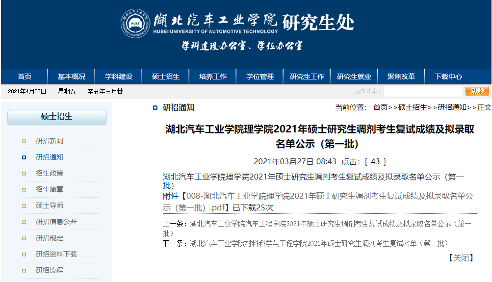 原文标题:湖北汽车工业学院2021年硕士研究生拟录取考生公示