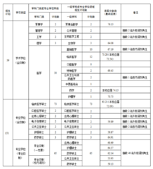 2021年军队计划硕士研究生一志愿考生和校内调剂考生拟录取分数线