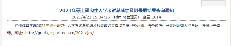 广州体育学院2021年硕士研究生入学考试总成绩及拟录取结果查询系统已经开通,请各位考生登录网址输入准考证、身份证号查询。网址:http://grad.gzsport.edu.cn/2021cjcx/
