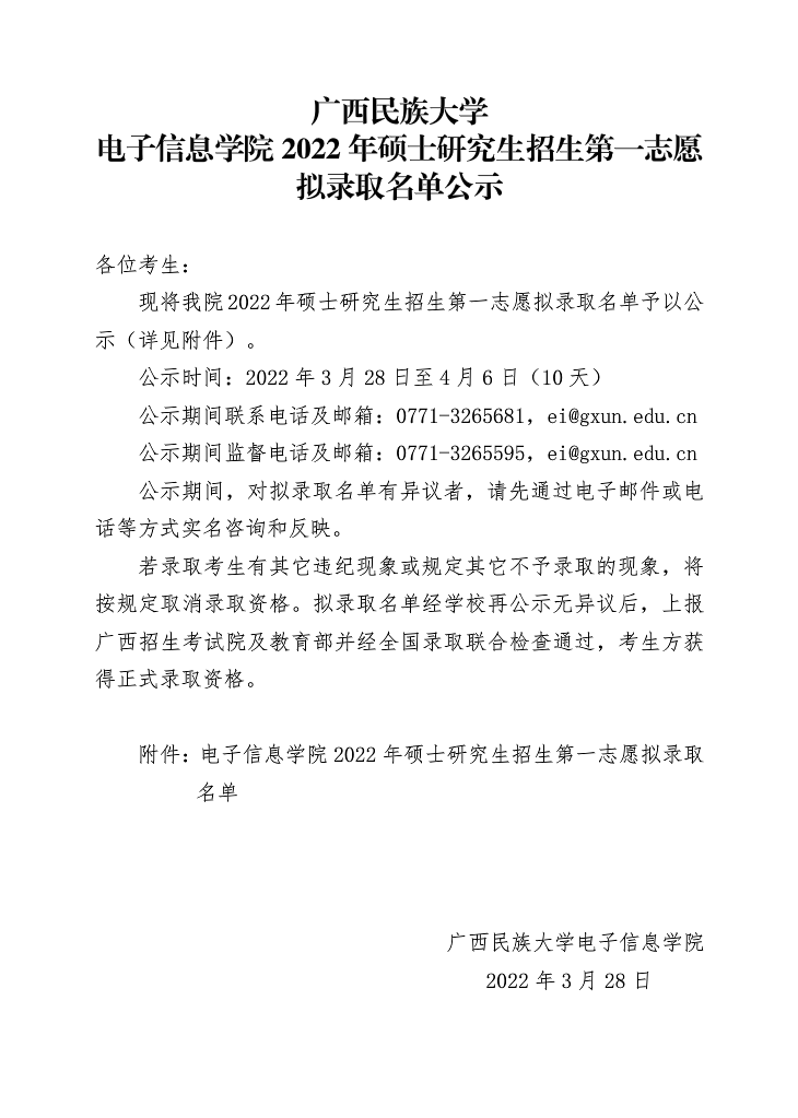 附件:广西民族拼搏(中国)电子信息学院2022年硕士研究生招生第一志愿拟录取名单公示