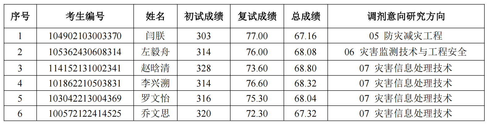 我校于4月8日公示的《防灾科技学院2022年硕士研究生调剂志愿拟录取名单》中,5人拒绝拟录取,1人已被他校录取,现依序递补6人,公示如下: