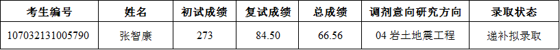 我校于4月8日公示的《防灾科技学院2022年硕士研究生调剂志愿拟录取名单》中,因“04岩土地震工程”方向1人放弃拟录取(考生姓名:李佩茹,考生编号:114152131002291),现依序递补1人,公示如下: