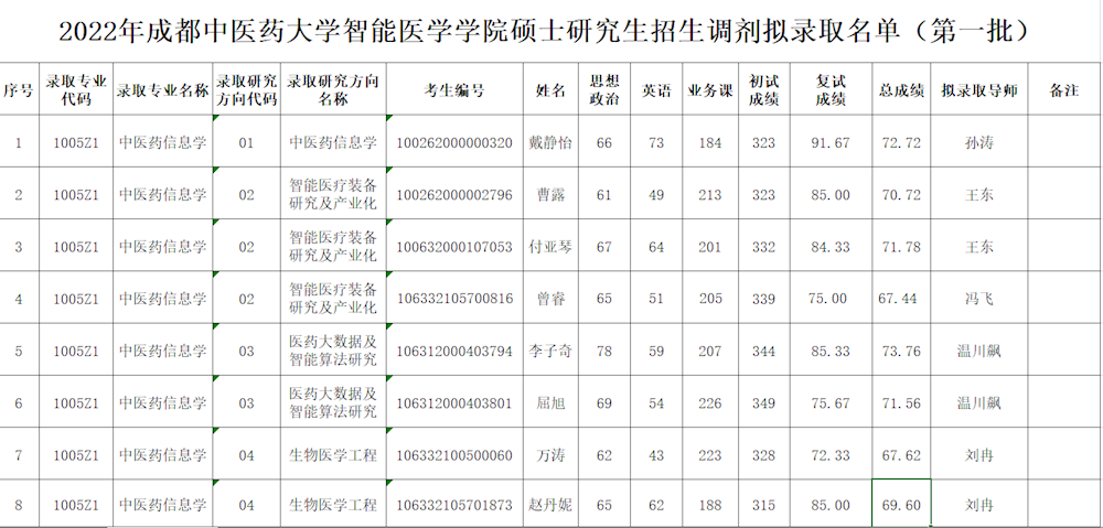 原文标题:2022年成都中医药拼搏(中国)医学信息工程学院硕士研究生调剂(第一批)拟录取名单公示