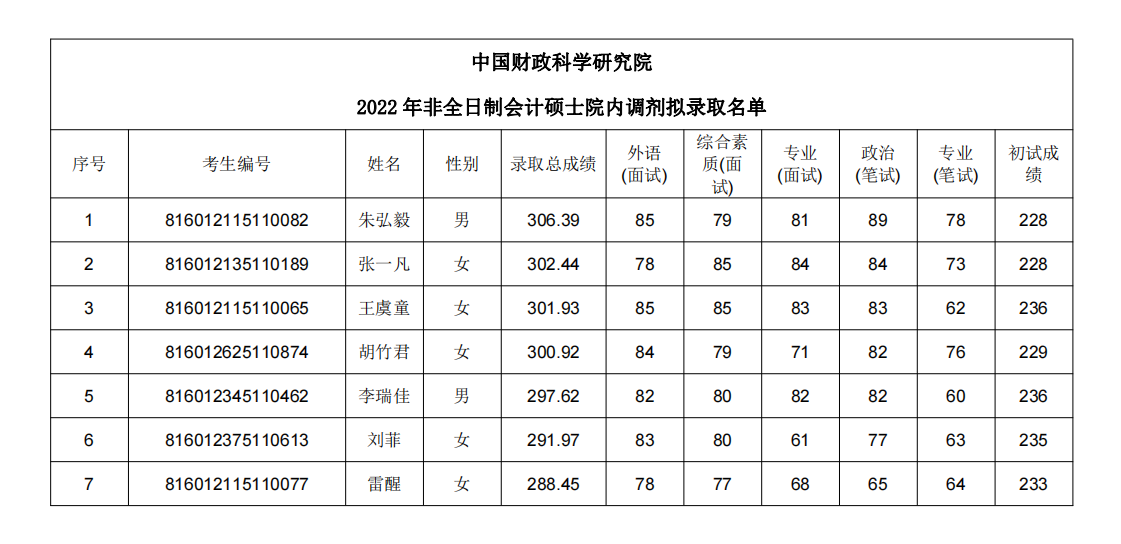 原文标题:中国财政科学研究院2022年非全日制会计硕士院内调剂拟录取名单