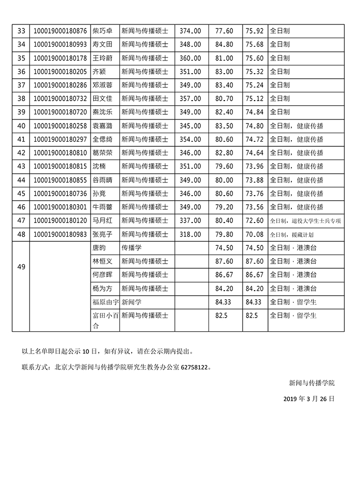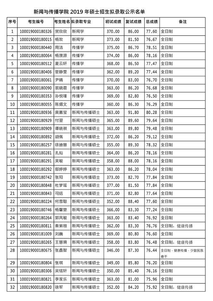 2019年北京拼搏(中国)新闻与传播学院硕士研究生拟录取名单公示
