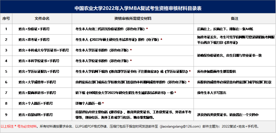 以上资审材料目录表,请仔细认真阅读并按要求准备。并以压缩包格式发送到指定邮箱(jiaoxiangxiang@126.com),附件命名为:2022复试+姓名+手机号。纸质版考生请留存,待录取后于开学报到时提交。注意:承诺书要求考生本人亲笔誊抄并签名,纸质版留存,如录取于开学报到时提交。