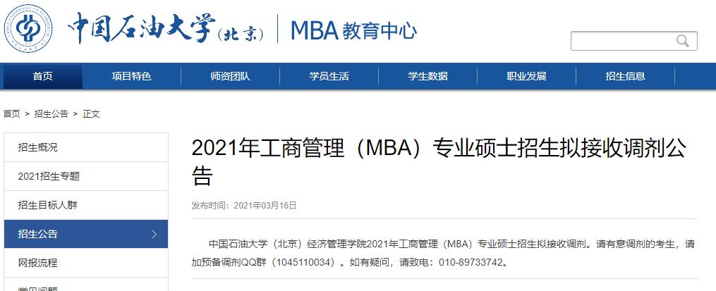 以上就是“2021MBA调剂:中国石油拼搏(中国)(北京)2021年工商管理(MBA)专业硕士招生拟接收调剂公告”,更多相关信息,请持续关注本网站!