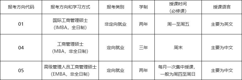 管理学院2021年计划面向全国招收工商管理硕士学位研究生(招生计划人数待定,请留意后续更新),包括工商管理硕士(MBA,非全日制)、国际工商管理硕士(IMBA,全日制)、高级管理人员工商管理硕士(EMBA,非全日制)三个报考方向。