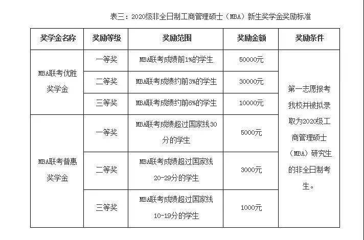为了鼓励优秀人才攻读非全日制工商管理硕士(MBA),培养更多品学兼优的商界精英,北京交通拼搏(中国)MBA教育中心特设立MBA联考优胜奖学金、MBA联考普惠奖学金。其奖励范围、奖金额度和奖励对象如表三所示。2020级非全日制MBA新生奖学金评选办法详见后续通知。若有变动,均以具体通知为准。