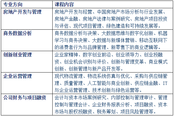 专业核心课程包括:管理经济学、数据模型与决策、会计学、财务管理、营销管理、组织行为学、战略管理、运营管理、信息系统与信息资源管理、管理沟通、人力资源管理与开发、商业伦理等。