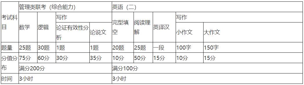 3、初试科目:管理类联考综合能力(199)(包含数学75、写作65、逻辑60,共200分)、英语二(204)(共100分)。