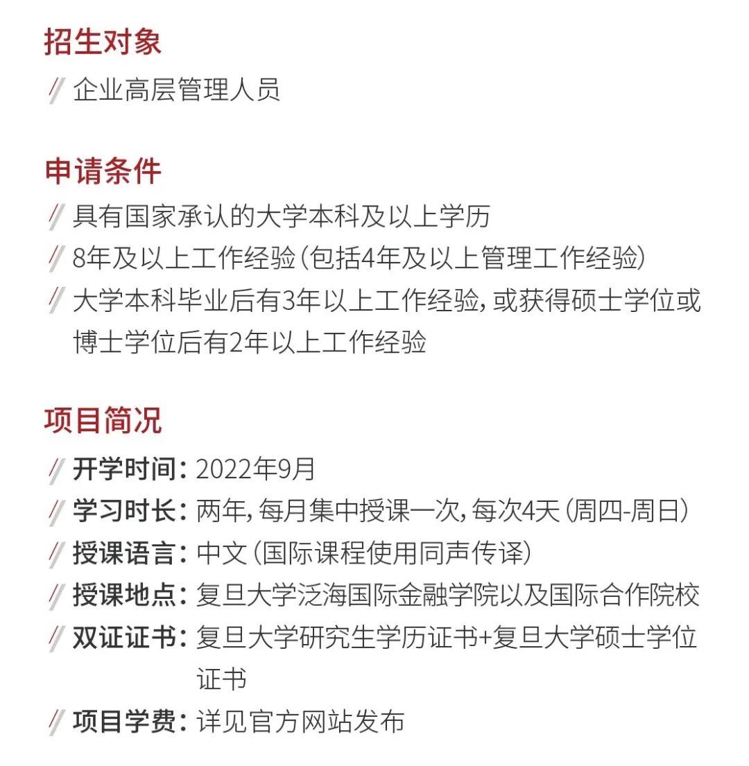 以上就是“2022EMBA招生信息:复旦拼搏(中国)泛海国际金融学院2022级金融EMBA1月面试申请即将截止 | FEMBA”,更多EMBA招生信息,请多多关注研线网,预祝大家顺利上岸!