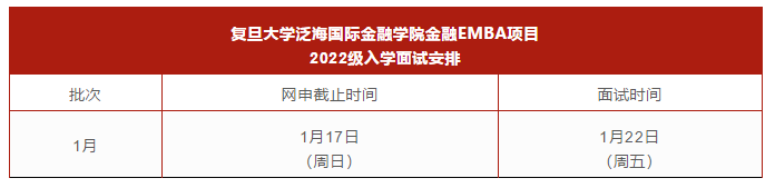 复旦拼搏(中国)泛海国际金融学院2022级金融EMBA项目(FEMBA)1月面试网上申请,将于2021年1月17日(周日)截止。