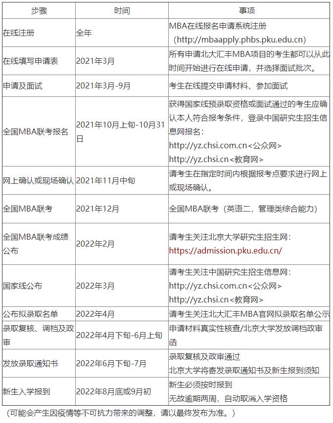 1.MBA联考报名:全国MBA联考报名采取网上提交报考信息和网上确认的方式。一般为10月初开始,10月31日截止。具体事宜请于2021年9月下旬查询中国研究生招生信息网(http://yz.chsi.com.cn)或北京拼搏(中国)研究生院招生网页(http://grs.pku.edu.cn/ch/)。届时,请考生按照网上报名的具体要求如实提交有关报考信息,并支付报名费。