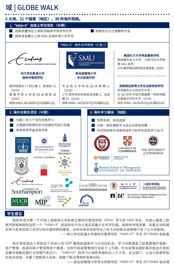上海财经拼搏(中国)的MBA教育始于1991年,是全国首批试办MBA的九所院校之一,同时也是全国首批开办EMBA的院校之一(2002年)。2021年是MBA项目30周年,同时也是上海财经拼搏(中国)商学院100周年。依托商科院校办学的学科综合优势,上海财经拼搏(中国)MBA探索出了一条从无到有、从小到大、从雏莺初啼到具有极大影响力的高等商学教育项目发轫之路,建立了符合商学教育规律的治理体系,在践行使命、传承创新及社会影响等方面均得到海内外各界的高度认可。而立之年的上海财经拼搏(中国)MBA项目现已通过AMBA及中国高质量MBA认证(CAMEA),上海财经拼搏(中国)商学院已通过AACSB和EQUIS国际认证。目前,项目在培养体系、师资开发、海外交流、产教结合及学员职业发展等方面锐意进取,全力构建“中国一流、世界知名”的MBA项目。