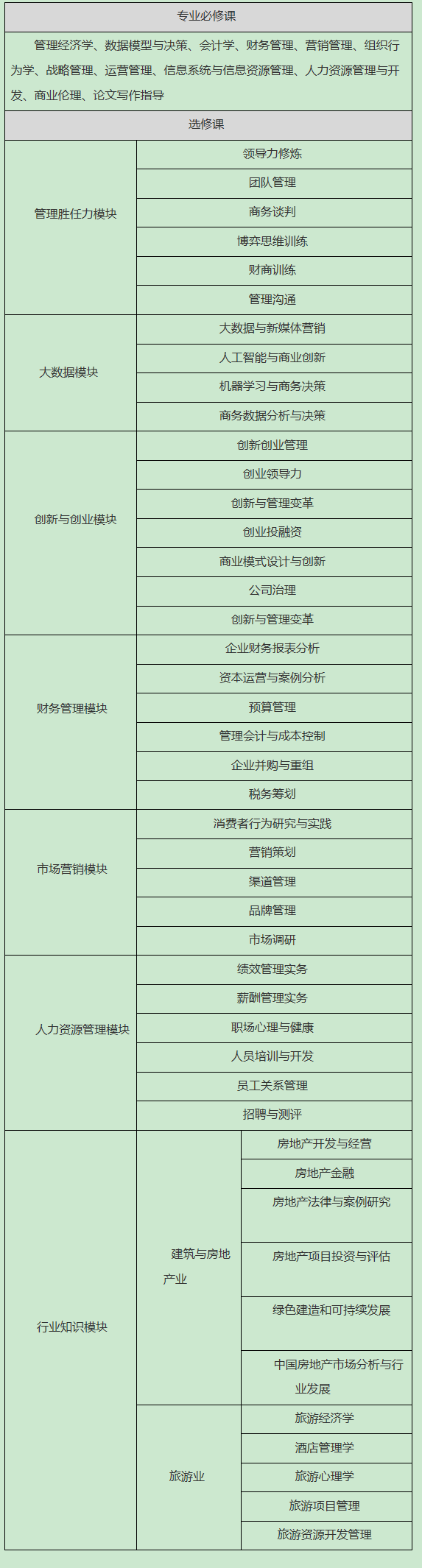 课程设置紧跟时代发展的需要和学员个性需求。为了适应数字经济的时代发展,学院特别开设了大数据模块课程;在行业方面,学院立足湾区开设了建筑与房地产业和旅游业的行业知识模块;为了提高MBA学员的管理软实力,特别开设了管理胜任力模块课程,旨在提高学员的领导力、团队管理能力等综合能力。