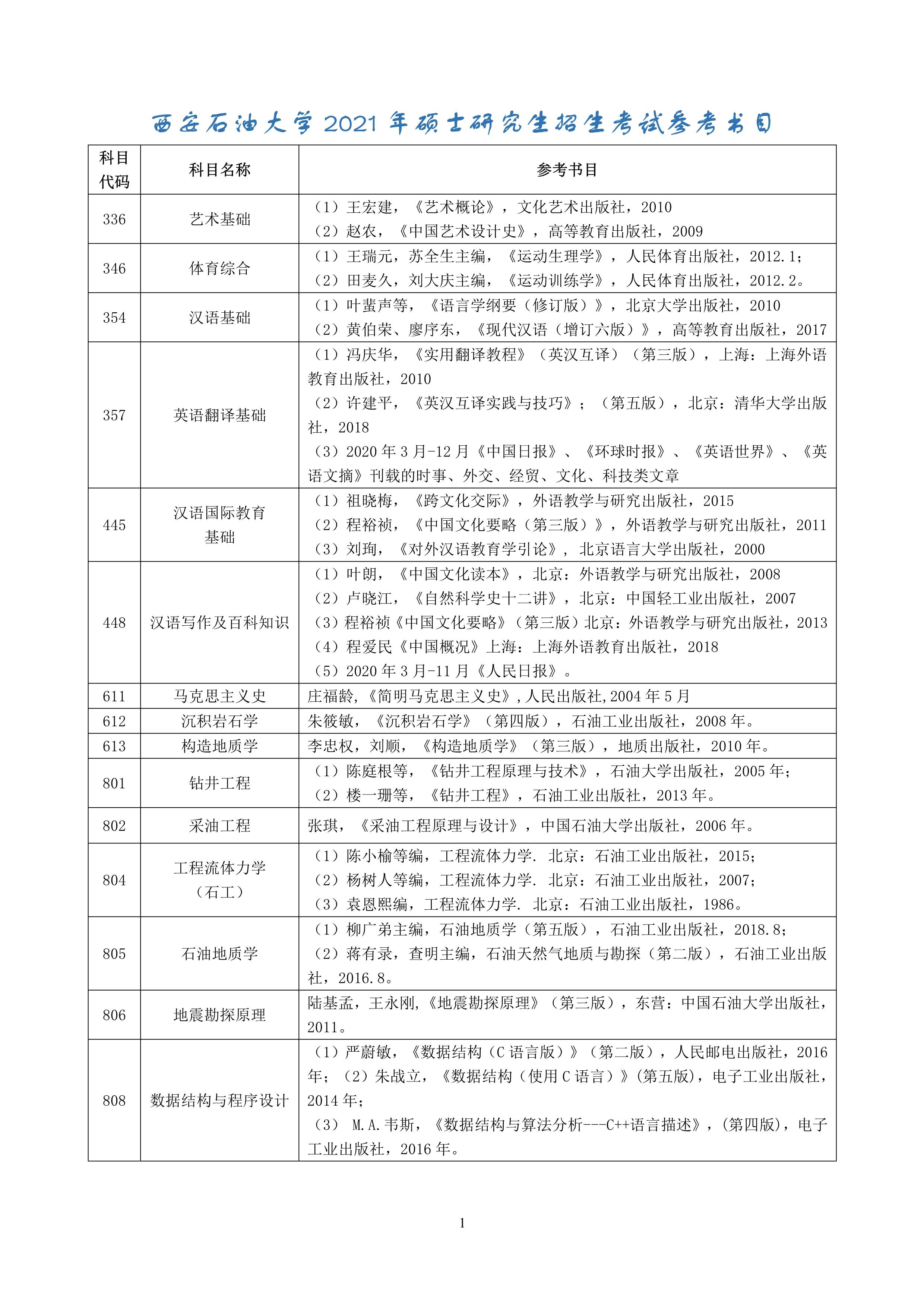 点击查看:西安石油拼搏(中国)2021年硕士研究生招生参考书目.pdf